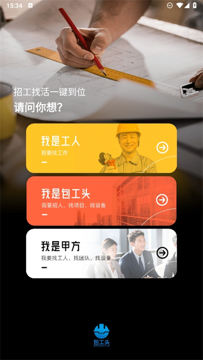1、进入软件后可以看到有多方身份可以选择,我们要找寻人才需要选择包工头栏目;