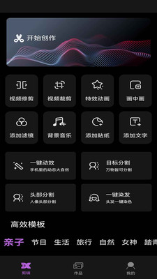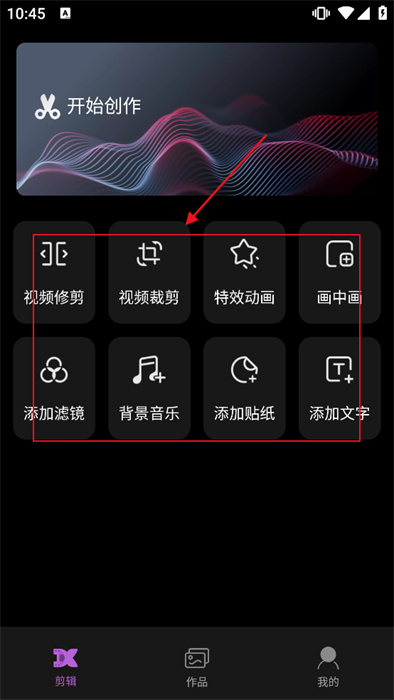 2、随后,进入到首页,可以看到很多编辑的工具,如裁剪、特效、贴纸等等;