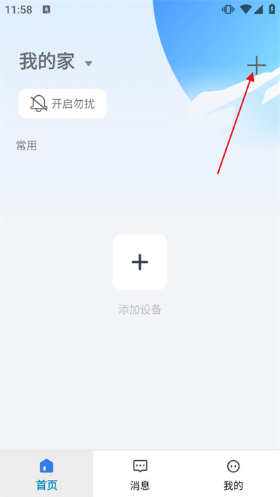 4、接着,进入到首页,点击右上角的加号按钮,并点击【添加设备】;