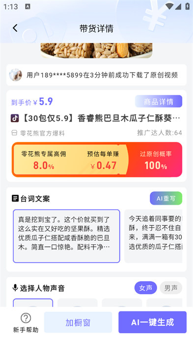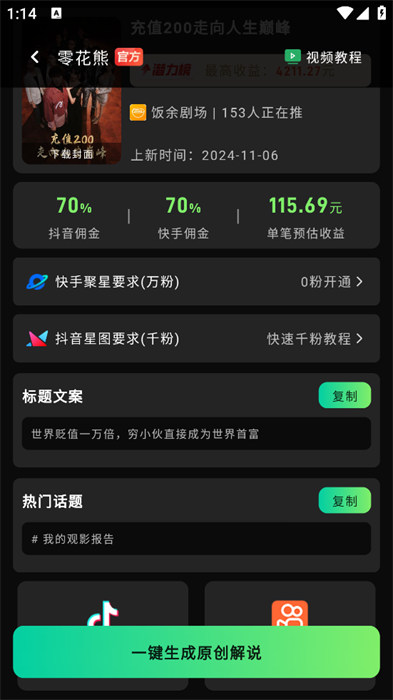 4、点击自己想要推广的短剧就能一键直接生成原创的内容;