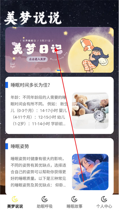 这里在首页上给大家准备了多种尝试好用的睡眠方式,如睡眠姿势、睡眠市场等等都可以尝试;