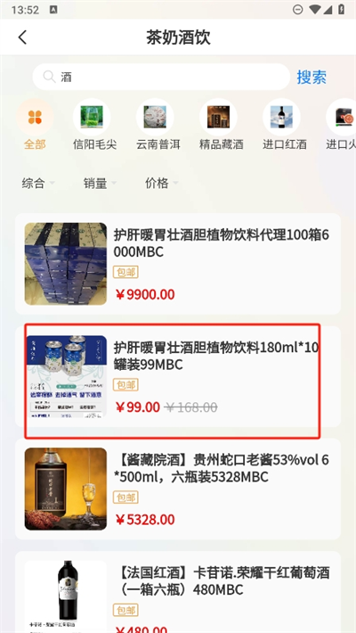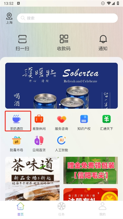 1、进入软件后可以根据自己想要购买的商品进行喧杂,比如我们想要查看茶奶酒饮产品;