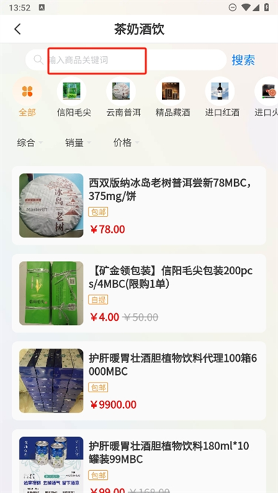 2、接着进入商品栏目中可以通过输入商品关键词进行搜索,就会弹出相关的商品进行购买;