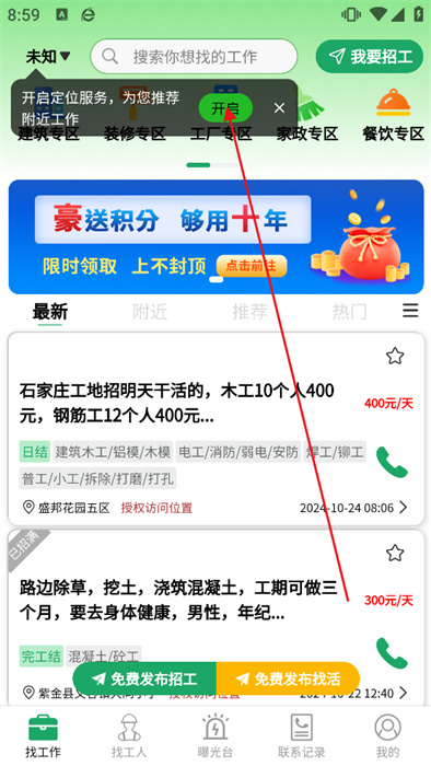 2、随后,进入到软件首页上,点击最上方【开启定位】这样才能了解到周边的招聘信息;