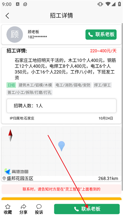 4、最后,在筛选了定位以及位置信息之后,找到最下方的绿色按钮【联系老板】可继续了解岗位。