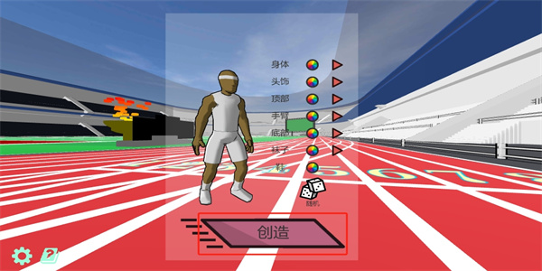 2、在这里选择运动员不同部位的装饰,组建出一个自己心满意足的运动员,或者可以点击【随机】快速的生成出一个运动员,点击创造完成当前的运动员装饰;