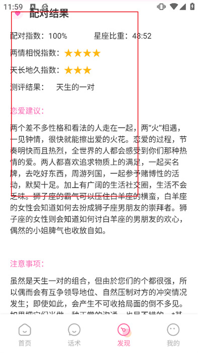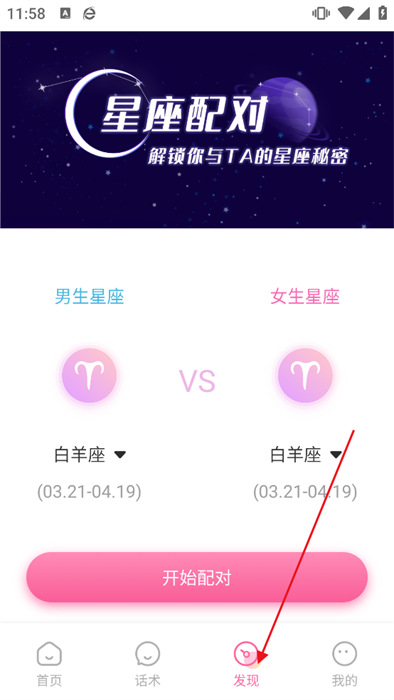 3、同样大家还可以在这里进行星座的配对,切换到【发现】页面,随时能更换男女生的星座;