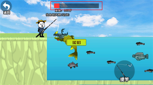 5、不断的点击屏幕右下角的【提竿】按钮,以使得小鱼能够被提起来,当上方的红色进度条掉完之时,即意味着成功;