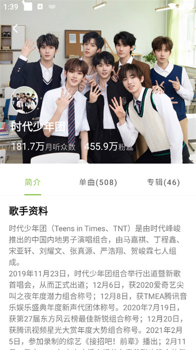 5、点击自己感兴趣的歌手就能看到详细的相关介绍信息和歌曲等。