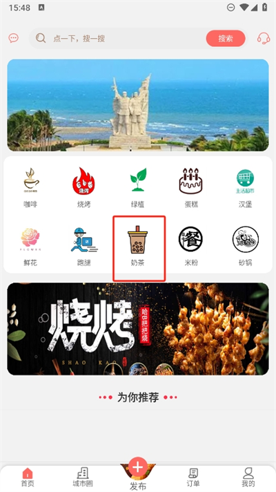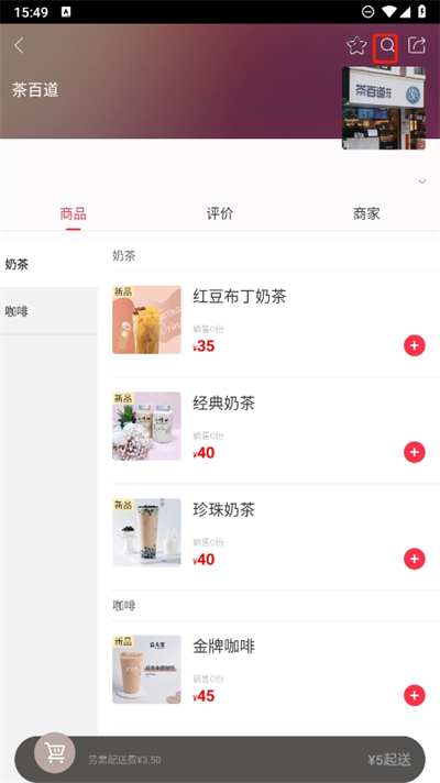 2、进入后可以看到奶茶和咖啡的分类,我们可以通过在右上角这里进行搜索想要的饮品;