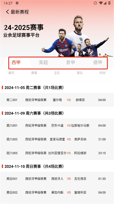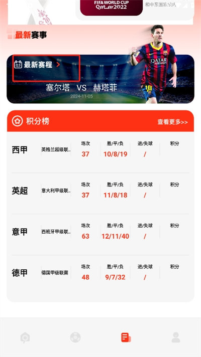 2、进入后可以看到最新的赛程信息,点击进入查看更多球队的比拼了解足球赛事的对决;