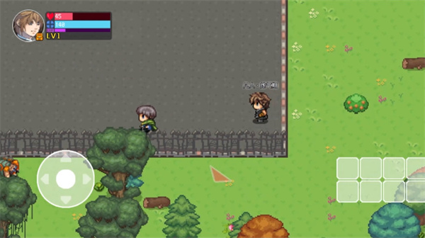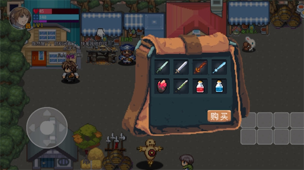 1、来到一个充满怀旧复古的小村庄里面,与这个小英雄点击左边的滑动按键,在这里进行历险探索,从一个什么都没有的凡人成长起来;