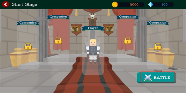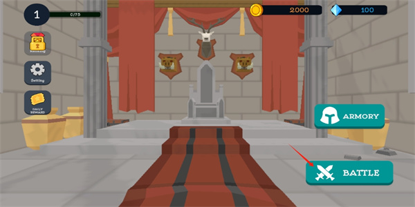 1、在一个城堡王座的背景空间之中展开超级自由的冒险,点击右下角刀剑相交织的【BATTLE】,进入古世纪背景探险世界之中;