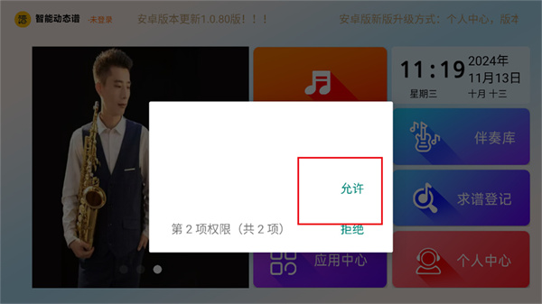 2、随后,软件需要获取一些使用权限,按照这里的提示来点击【允许】,如下图;