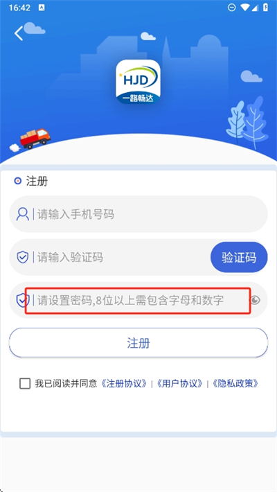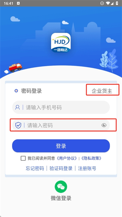 2、接着我们就会来到注册的界面,我们可以看到在这里身份将会变身成为企业货主进行登录;