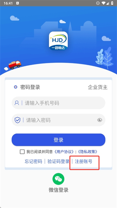 3、如果没有账号不用担心,在这里可以看到注册账号的功能,点击进入开始企业货主身份的注册;