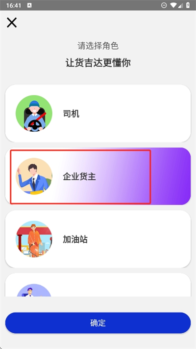 1、进入软件后需要根据想要注册的角色选择,比如你想要企业货主的身份进入使用点击即可;
