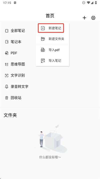 2、可以看到这里支持新建笔记、新建文件和导入pdf或者导入笔记功能,我们选择新建笔记;
