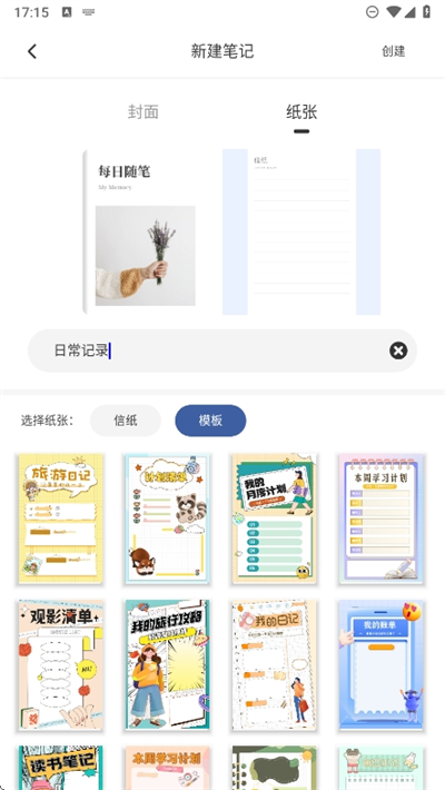 3、接着我们可以选择自己的封面和笔记的名称后,在更换纸张的模板或者信纸的模板后点击创建;