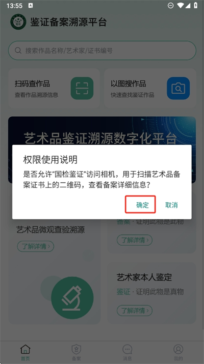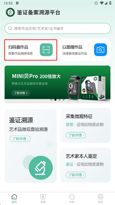 1、进入鉴证备案溯源平台后可以看到在这里拥有扫码查询功能,快速的查看作品的溯源信息;