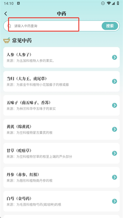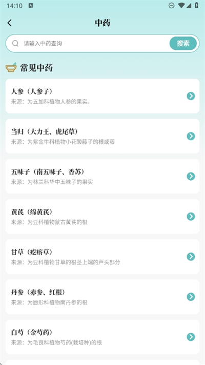 2、进入后可以看到一些常用的中药,还可以看到来源信息和中药材的详细信息;