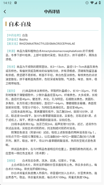 4、比如我们找寻以白术的中医药材,点击进入就可以看到有关该中药的性情信息等等。
