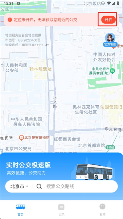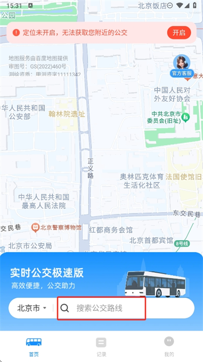 1、进入软件后可以先进行定位的开启,然后就可以自动获取周边附近的实时公交冬天信息;