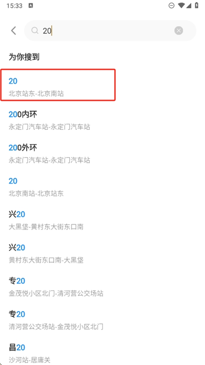 3、进入搜索栏目中可以搜索自己想要了解的公交车信息,比如我们以北京20路公交车为例;