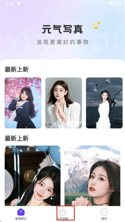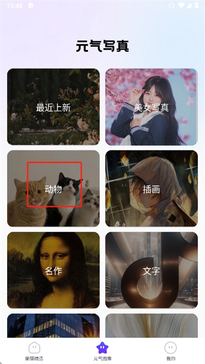 1、进入软件后可以在元气图库中查看寻到不用的图片分类,大家可以根据喜好选择不同的类型;