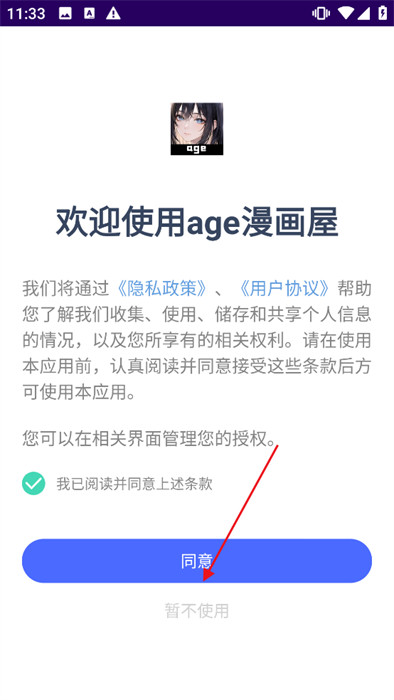 1、将软件从桌面上下载进入其中,在阅读了隐私条例之后点击【同意】如下图所示;