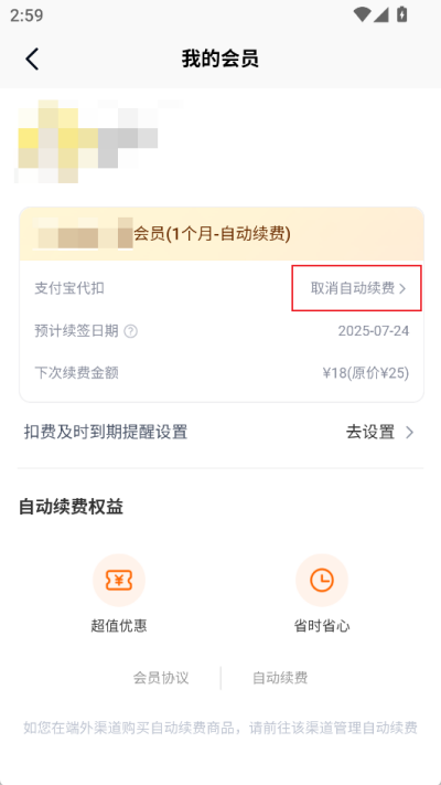 4、点击后即可进入会员管理界面,在这里可以查看已经开通的会员服务,在对应会员后面会有【取消自动续费】选项,点击后即可关闭自动续费。