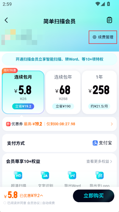 3、之后进入会员开通界面,在上面的位置有【续费管理】选项,点击一下;