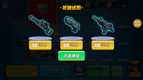 4、玩家还可以通过观看广告的方式获得试用武器,这些试用武器的威力都是十分强大的,不需要的话也可以点击继续选项进入游戏;