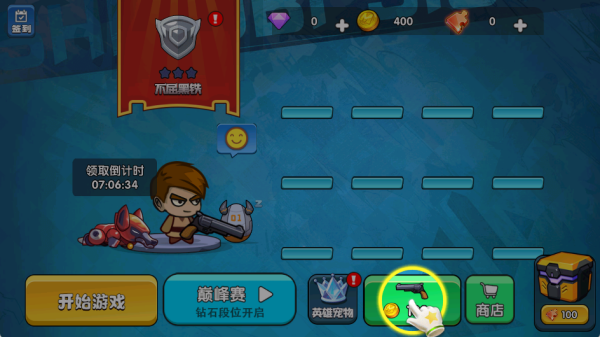1、进入游戏后,点击界面下方的武器按钮,点击后可以获得武器道具,点击2次可以获得两个武器道具;