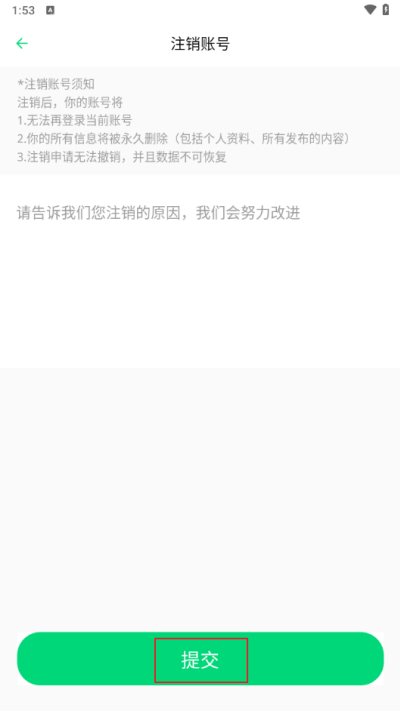 5、点击后跳转到注销账号界面,查看注销账号须知,确认无误后点击下方的【提交】选项即刻成功注销账号。