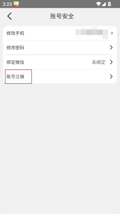 4、点击后进入账号安全管理界面,在这里可以修改自己的绑定手机以及账号密码等,点击其中的【账号注销】选项;
