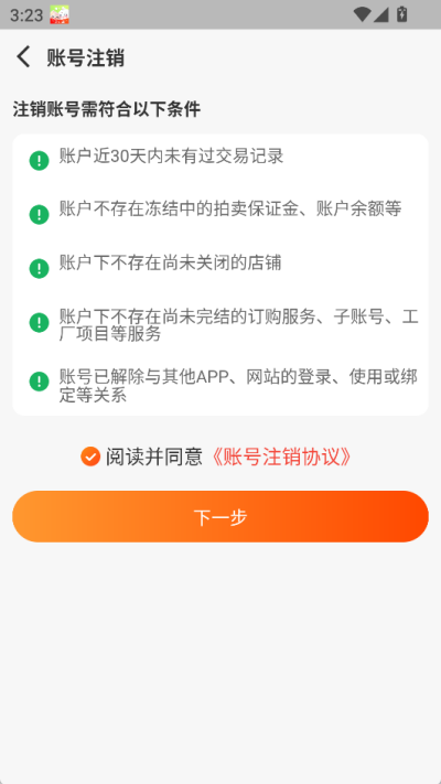 5、点击后进入账号注销界面,在这里查看账号注销的所需条件,确认无误后点击【下一步】;