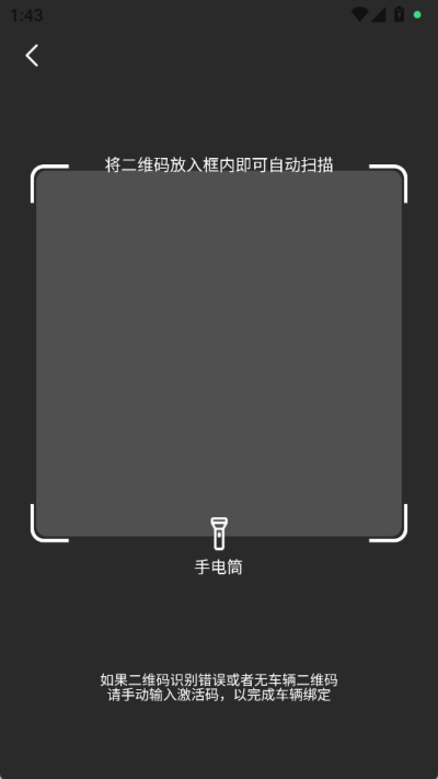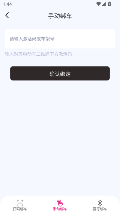 4、用户也可以选择手动绑车,点击手动绑车功能,在该界面输入激活码或者车架号即可成功绑定电动车;