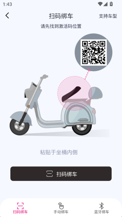 2、点击后进入扫码绑车界面,激活码的位置在坐桶内侧,打开电动车的坐桶进行查看;
