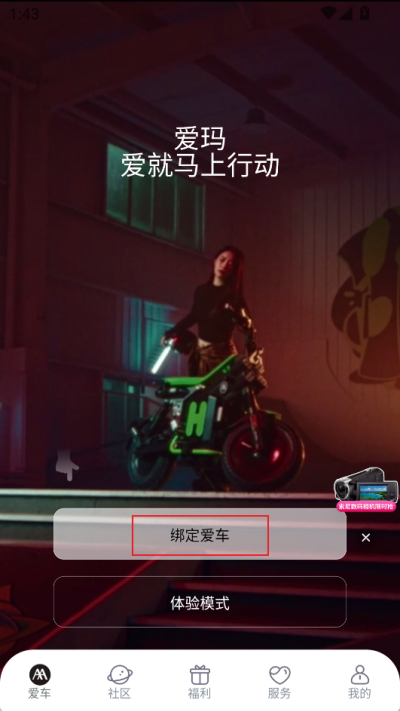 1、首先打开下载好的爱玛出行app,进入软件后登录自己的账号,然后点击界面上的【绑定爱车】;