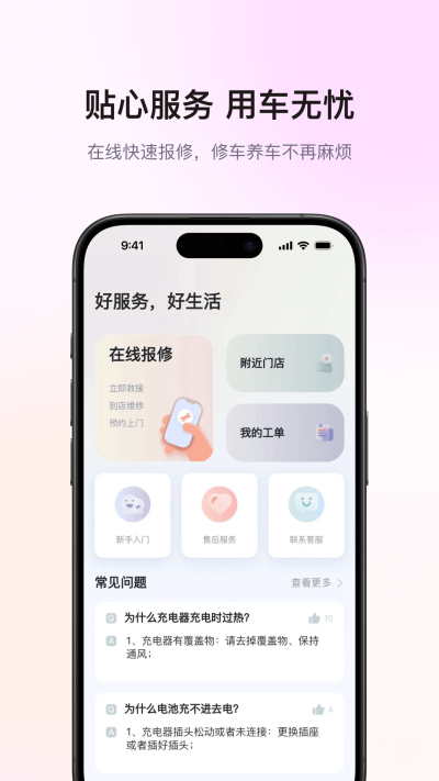 方便的在线报修功能,当车辆出现故障时,可以在线上进行报修,上门维修。
