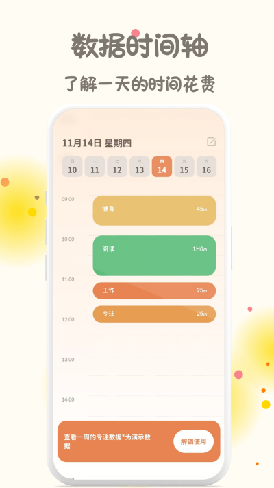 3、拥有方便的数据时间分析,通过分析不同的数据时间轴,深刻剖析你的专注时间情况。