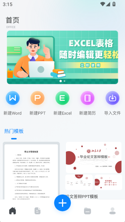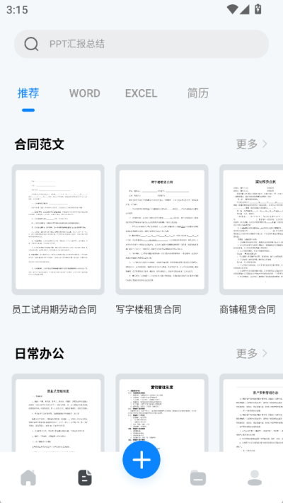 提供大量Excel表格、Word文档、PPT幻灯片模板供用户使用,其中包括个人简历制作模板、工作总结模板、合同模板、租赁合同模板、兼职合同模板、工作汇报表等。让您用手机办公更高效。