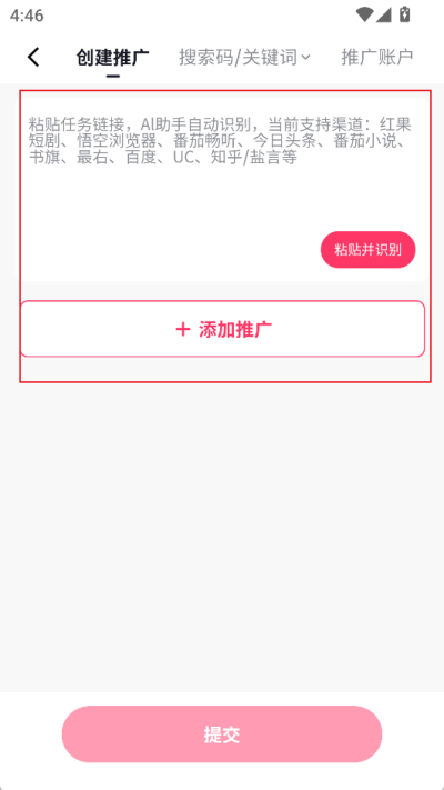 4、绑定成功后点击创建推广功能,然后粘贴任务链接,AI助手会自动识别任务,点击【粘贴并识别】选项,然后点击【添加推广】,全部内容都设置完毕后,点击下方的【完成】选项即可。