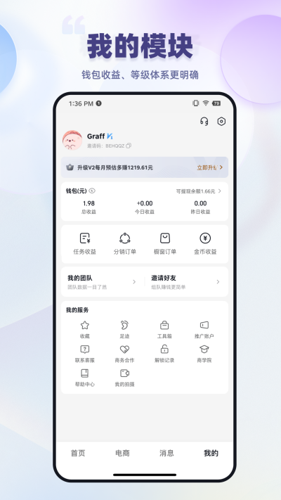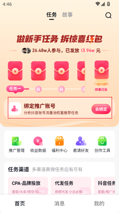 2、点击后进入任务功能界面,在这里可以选择相应的推广任务赚钱,我们先绑定自己的推广账号;