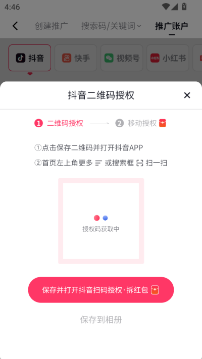 3、进入绑定账号界面后,在这里可以通过扫描二维码的方式绑定推广账号,支持绑定抖音、快手、微信视频号、小红书等第三方软件;