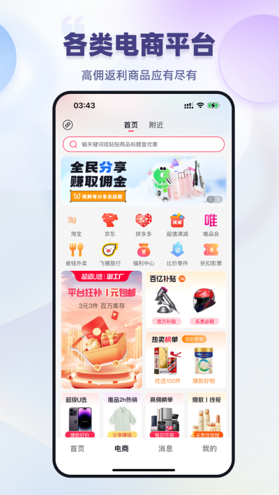 包含京东、唯品会、拼多多、淘宝、美团、饿了么等国内知名电商和本地生活服务平台,拥有海量高佣金商品,提供商品分销、本地生活优惠、橱窗商品推广服务,轻松实现自购省钱,分享赚钱。