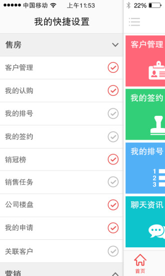 6、隐藏【社交】和【营销】整个模块。将【营销】里面【带看客户】入口放到首页固定