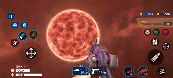 3、怪异形状的异性怪物被分布在各个区域,第一视角的对其进行射击,将其在自己精准的瞄射之下成功击败,点击子弹的按键发射火力。