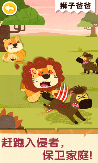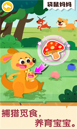 2、模拟动物:模拟了动物的日常活动,例如袋鼠爸爸保卫家园对抗野狗,狮子妈妈捕猎喂养小狮子,让孩子在游戏中体验动物生活的乐趣,并学习简单的生存技能。